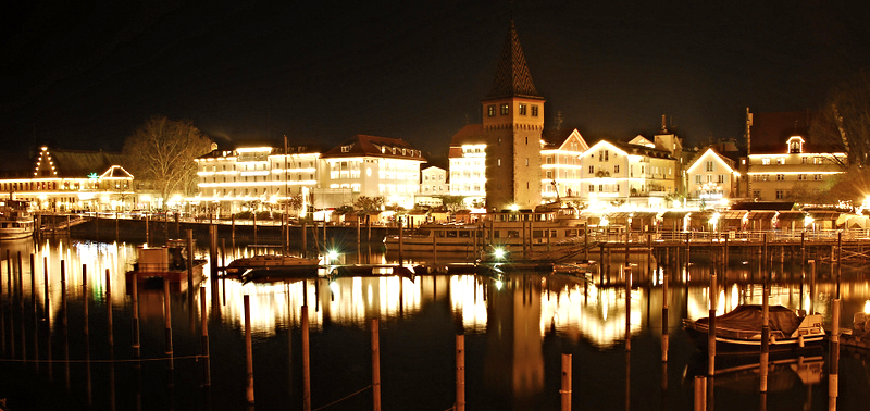 Bild: Der Lindauer Seehafen bei Nacht....funkelnd schön! Das zweite Haus rechts neben dem sogenannten Mangturm ist das Hotel Schreier.